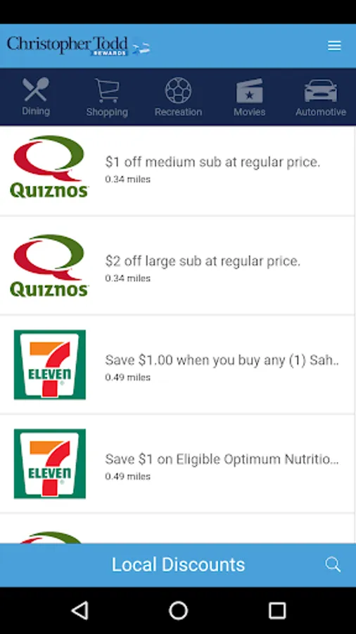 The Christopher Todd Rewards app allows you to redeem unlimited discounts at over 250,000 local & national merchants on the go! No more paper certificates! Receive discounts for Dining, Shopping, Recreation and more. The Merchants within a 30-mile radius of your location will automatically be displayed for each category.