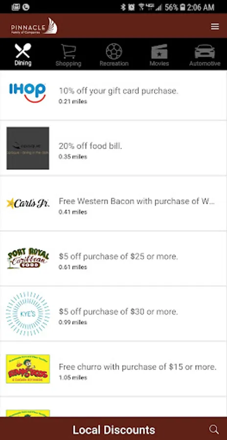 The Pinnacle Mobile App allows you to redeem unlimited discounts at over 250,000 local & national merchants on the go! No more paper certificates! Receive discounts for Dining, Shopping, Recreation and more. The Merchants within a 30-mile radius of your location will automatically be displayed for each category.