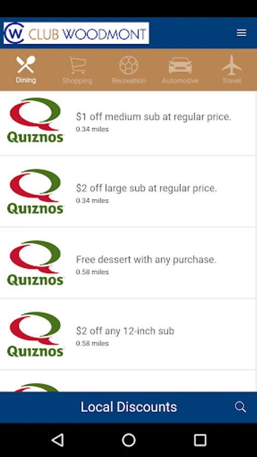 The Club Woodmont Rewards app allows you to redeem unlimited discounts at over 250,000 local & national merchants on the go! No more paper certificates! Receive discounts for Dining, Shopping, Recreation and more. The Merchants within a 30-mile radius of your location will automatically be displayed for each category.