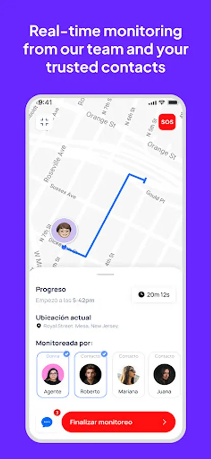 Real-Time Monitoring: Our agents con monitor any situation in real-time, providing guidance and support when it’s needed most. It's great when going out at night, riding a cab, or going out with your girlfriends.