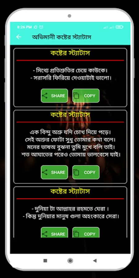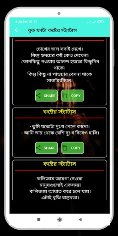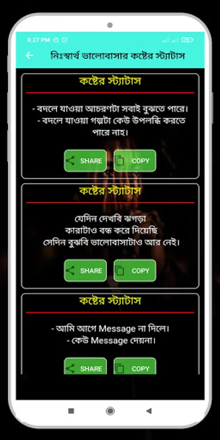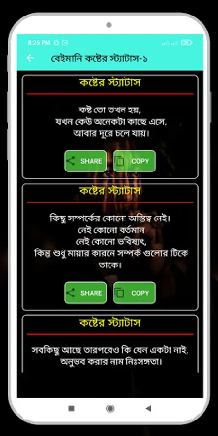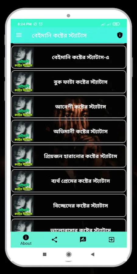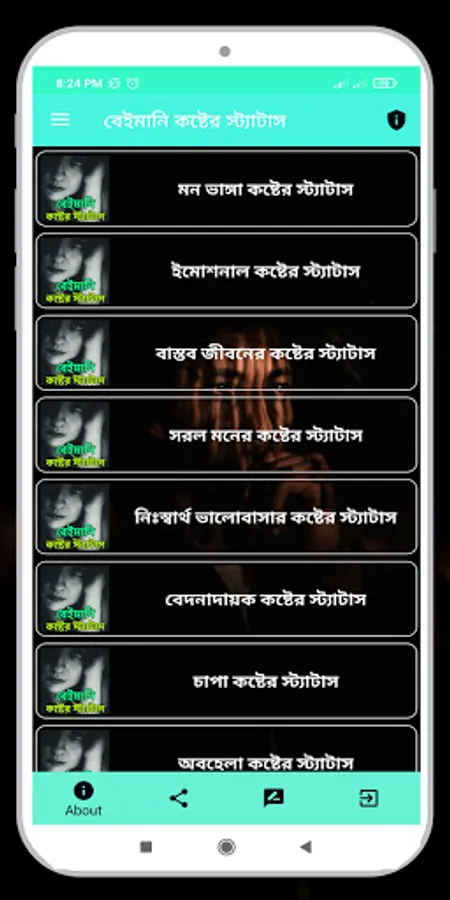 বেইমানি কষ্টের স্ট্যাটাস এই অ্যাপ্সটি থেকে আপনারা ভালোবাসায় বেইমানি করার সকল ধরনের কষ্টের স্ট্যাটাস-sms পাবেন। দুঃখ কষ্ট নিয়ে জীবন গড়ে ওঠে। কষ্টের কথা বা উক্তি গুলো পাওয়ার জন্য এই অ্যাপ্সটি ডাউনলোড করতে পারেন।
