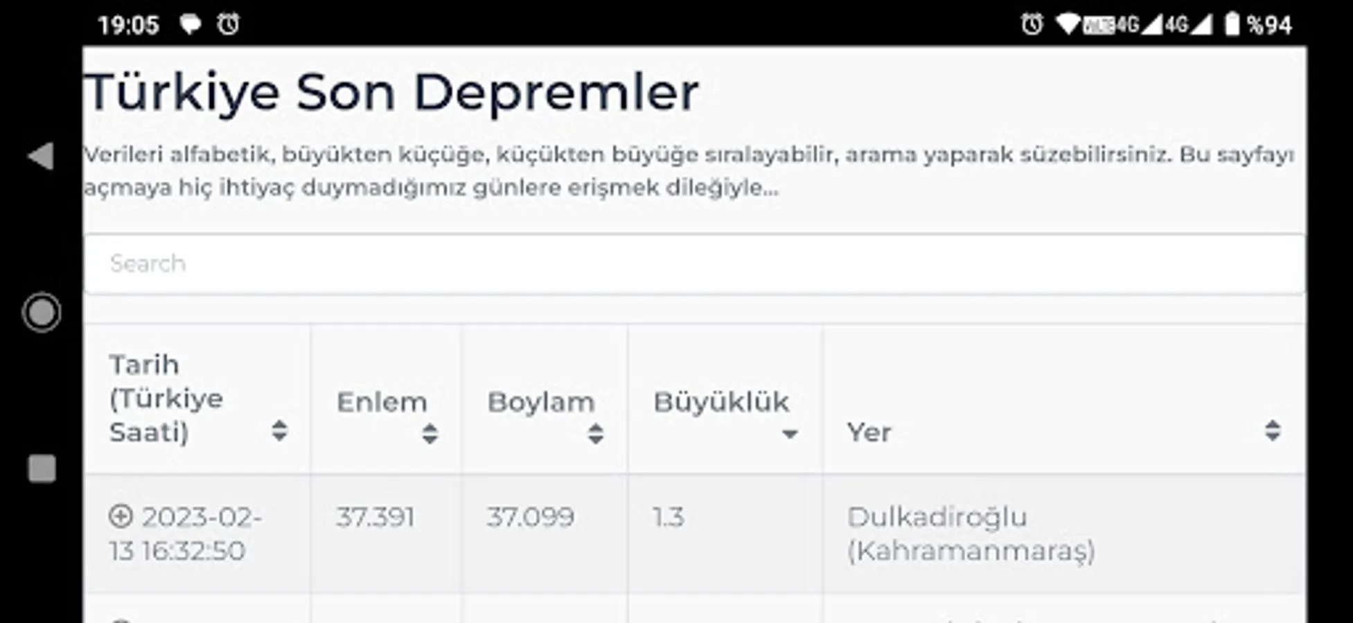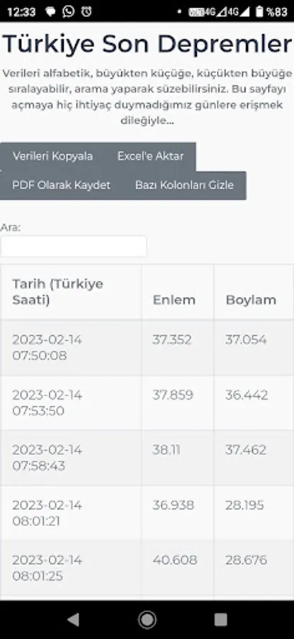 The last earthquake data page presented by official sources has been redesigned and visually enriched for researchers. Date data back to old, old to new; alphabetical data from A to Z; You can sort numerical data (intensity, depth of earthquake) from largest to smallest, from smallest to largest, and you can perform sensitive queries within the data thanks to instant search. You can save selected or all earthquake data as an Excel file or export as PDF with one touch.