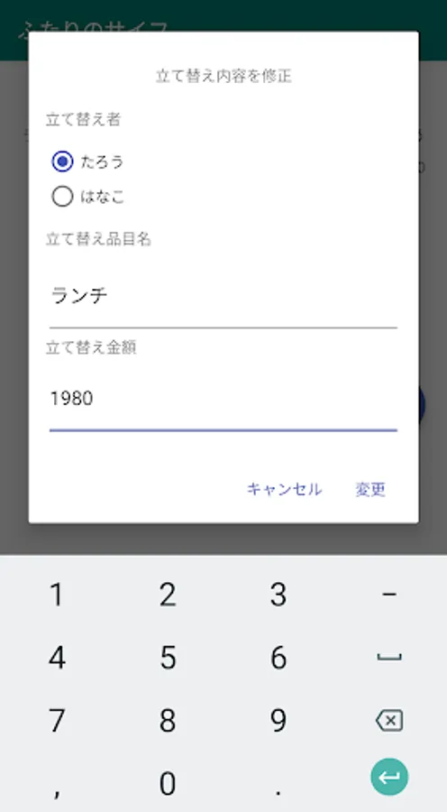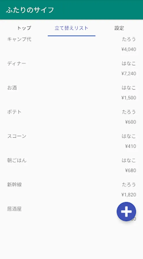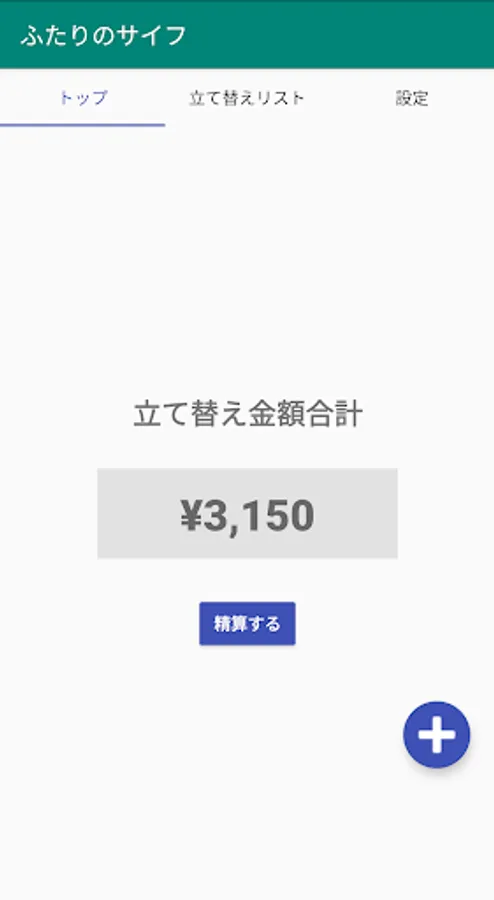 - ふたりの立て替え金額の合計を表示します。「精算」ボタンを押すと、立て替えたお金精算することができます。