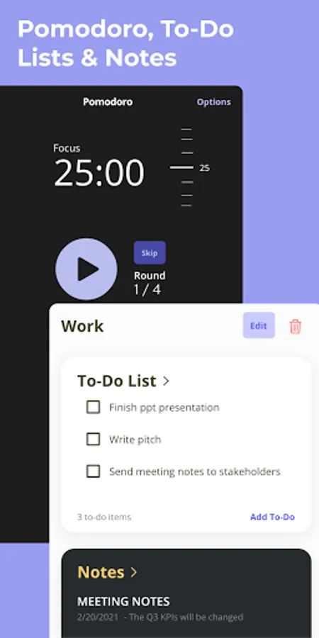 ◦ Focus timer: open the Pomodoro timer to apply the Pomodoro technique, set how long are the focus rounds, short breaks, and long breaks (the classic 25-10-30 technique or custom like 60 30 30)