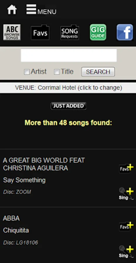 Browse DJ and Karaoke song books on your phone, and send song requests to the DJ's on stage laptop.