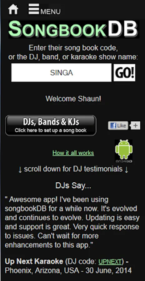 DJs and KJs >>>>>> you create, edit, and upload your song lists + receive requests via SongbookDB Pal, the free desktop software you get when you register a DJ account ( via the Android app or at https://www.songbookdb.com/?screen=registerDJ )