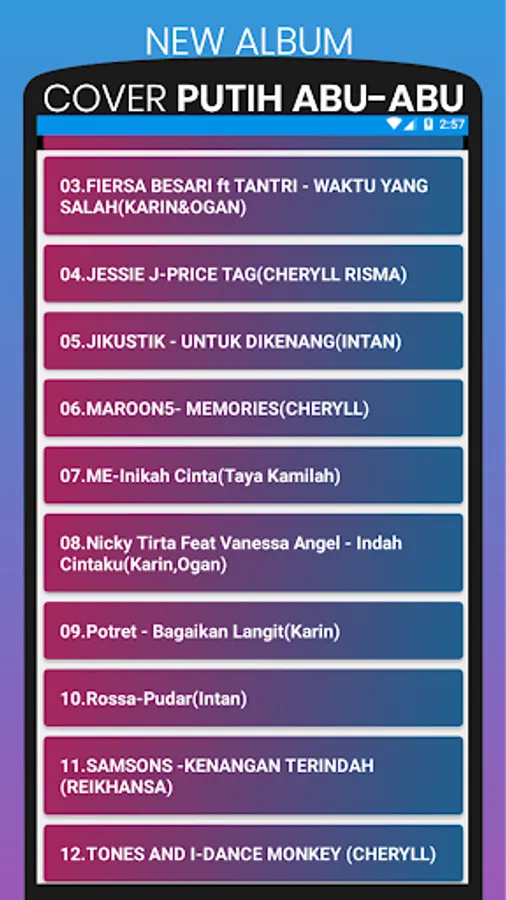 This album cover application is made for fans of white and gray channels. With this application you can listen to cover songs from white to gray offline without the internet. This album cover application is also equipped with song lyrics so you can sing karaoke together.