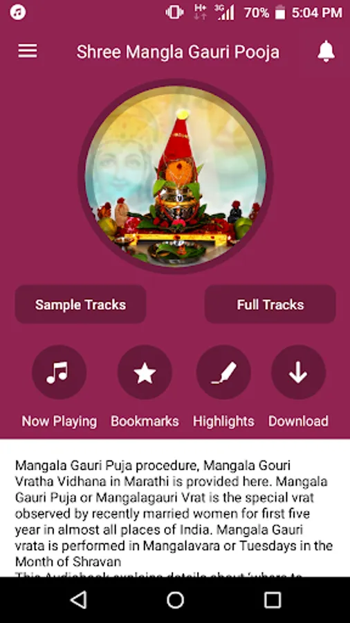 This app contains entire Shiv Mangla Gauri Pooja narrated by none other than Pt. V. K. Vaishampayan. This pooja is performed on Shravan tuesdays. This app contains entire pooja and the story of Goddess Mangala Gauri.