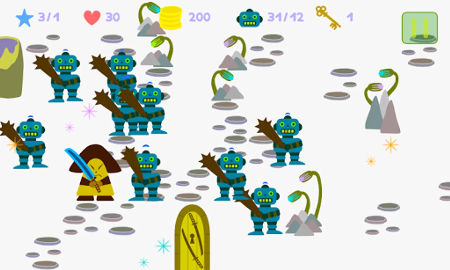 As soon as the robots get too strong you need always a green sword to defeat them. When you have a green sword it is only for a short distance.
