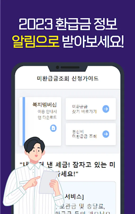 The application guide for non-refund inquiry provides information on refund amounts such as national taxes, local taxes, storage and delivery charges, and health insurance overpayments. Find out everything about the refunds you can receive with one application guide for unrefunded money balance! The application guide for non-refund inquiries informs you of the latest news through pop-up notifications.