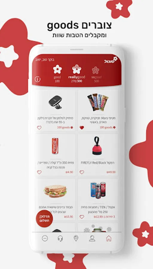 With the download of the app and registration, a 10goods gift and fresh, high-quality coffee will be waiting for you! Then, every time you enter the Sonol station or the Sogood stores and pay through the app (for the fuel and products in the store) you will continue to accumulate and accumulate (and accumulate) points - which you can use to realize equal benefits! Under warranty.