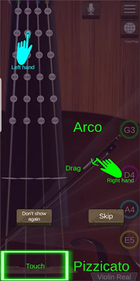 - Professional: Use 2 hands. Use right hand for dragging Violin bow (Arco) or touching Violin string (Pizzicato). Use left hand for choosing note (frequency) in Violin string.