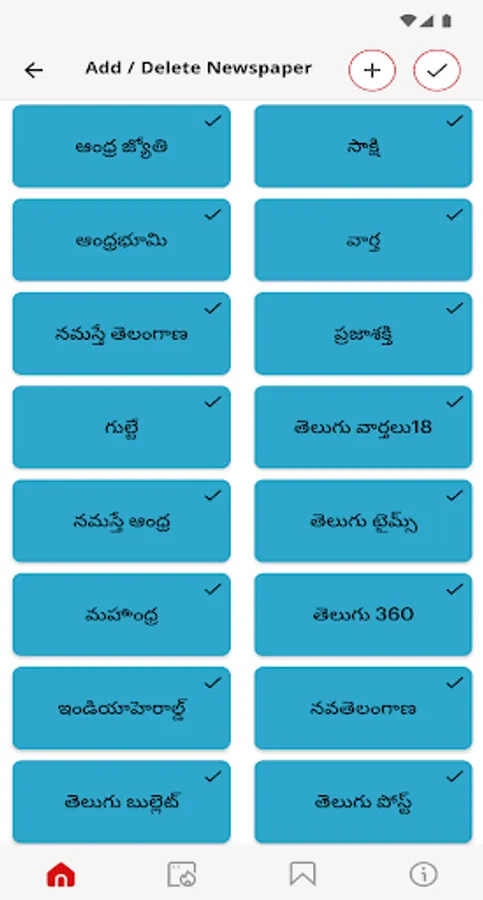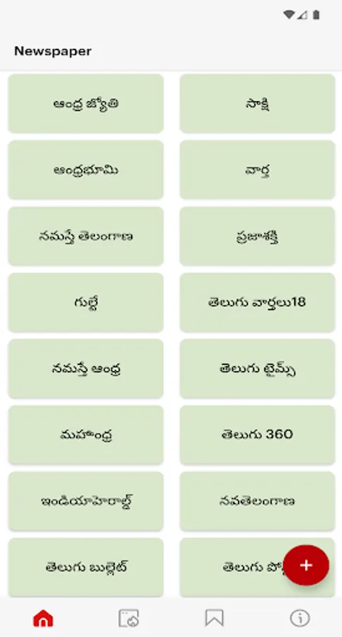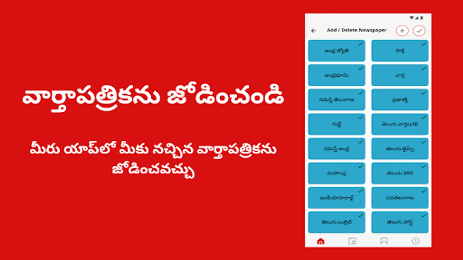 ఈ యాప్ ఆంధ్ర ప్రదేశ్, తెలంగాణ నుండి 28 తెలుగు వార్తాపత్రికలను జాబితా చేస్తుంది. ఆదిలాబాద్, నిజామాబాద్, కరీంనగర్, వరంగల్, మహబూబ్ నగర్, నల్గొండ, రంగారెడ్డి, రాయలసీమ, నెల్లూరు, ప్రకాశం, గుంటూరు, కృష్ణా. గోదావరి, విశాఖపట్నం, విజయనగరం మరియు శ్రీకాకుళం.