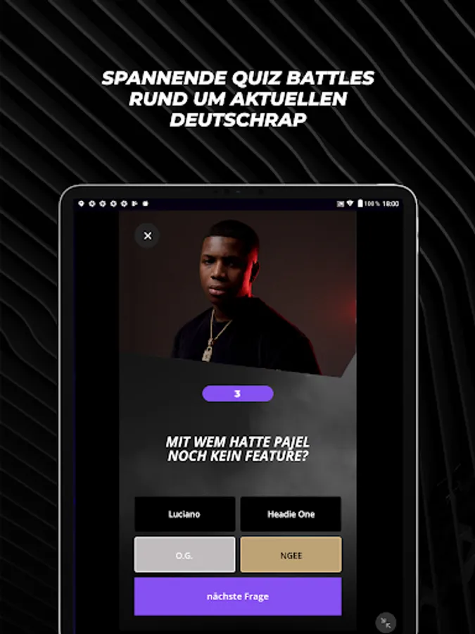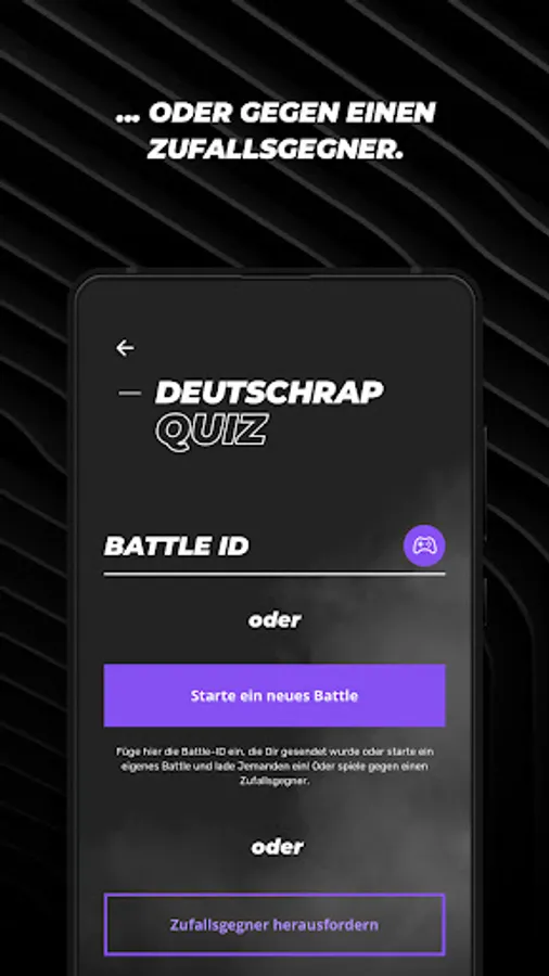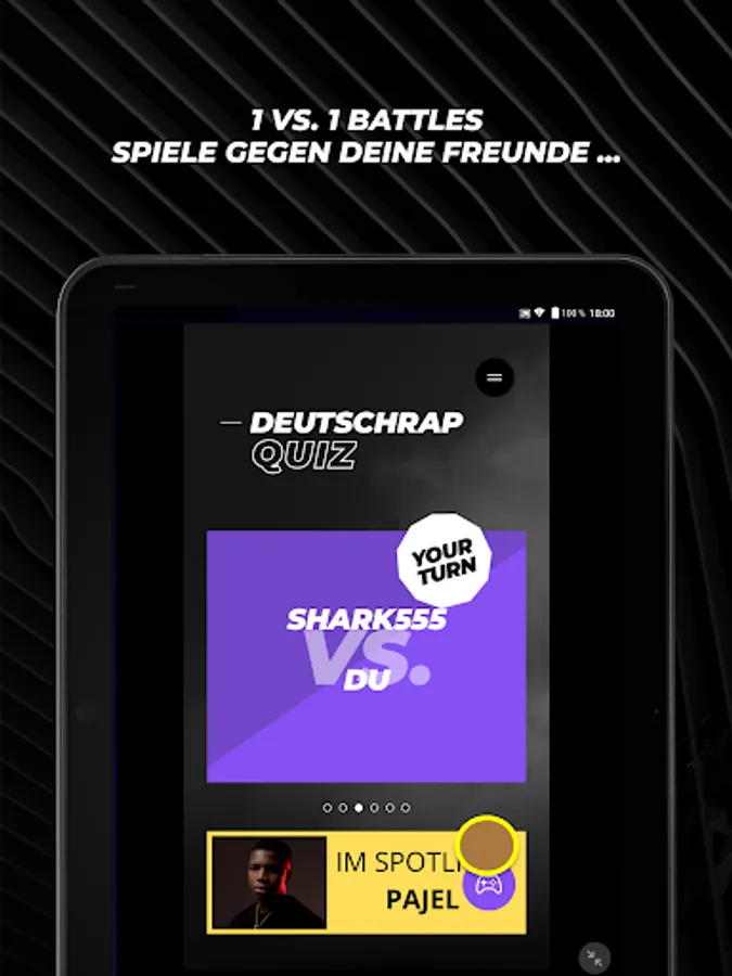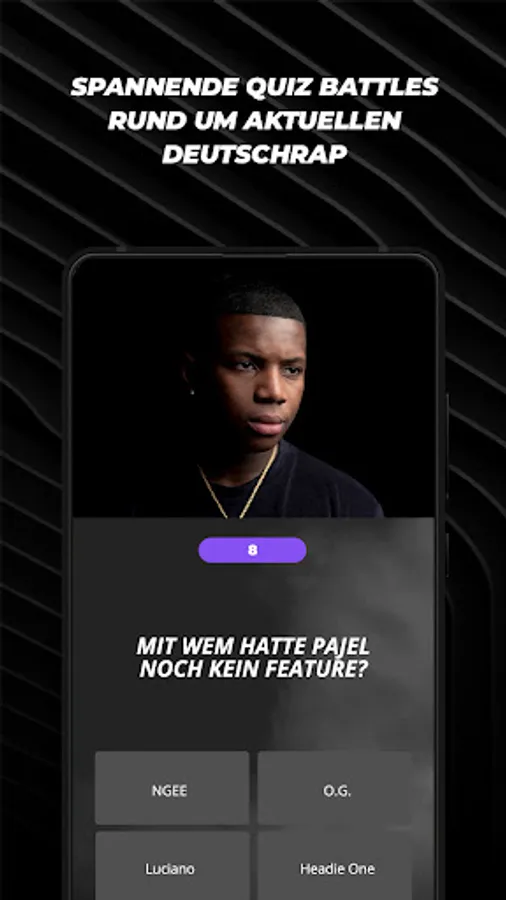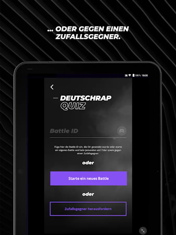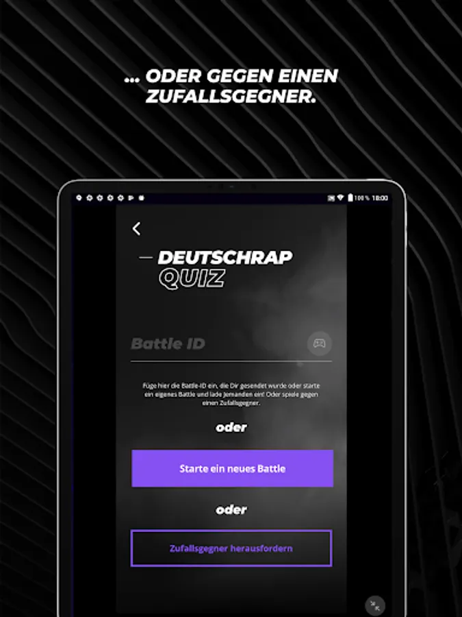 Deutschrap Quiz provides you with exciting 1vs1 battles about current German rap and everything that happens around it. Play against your friends or choose a random opponent! Battle lost? - No problem, because you can always request a rematch! If you create a profile, you can see all your played battles with their statistics.