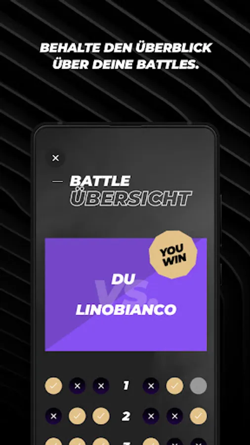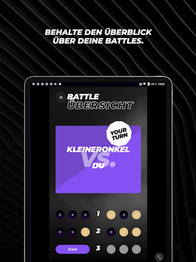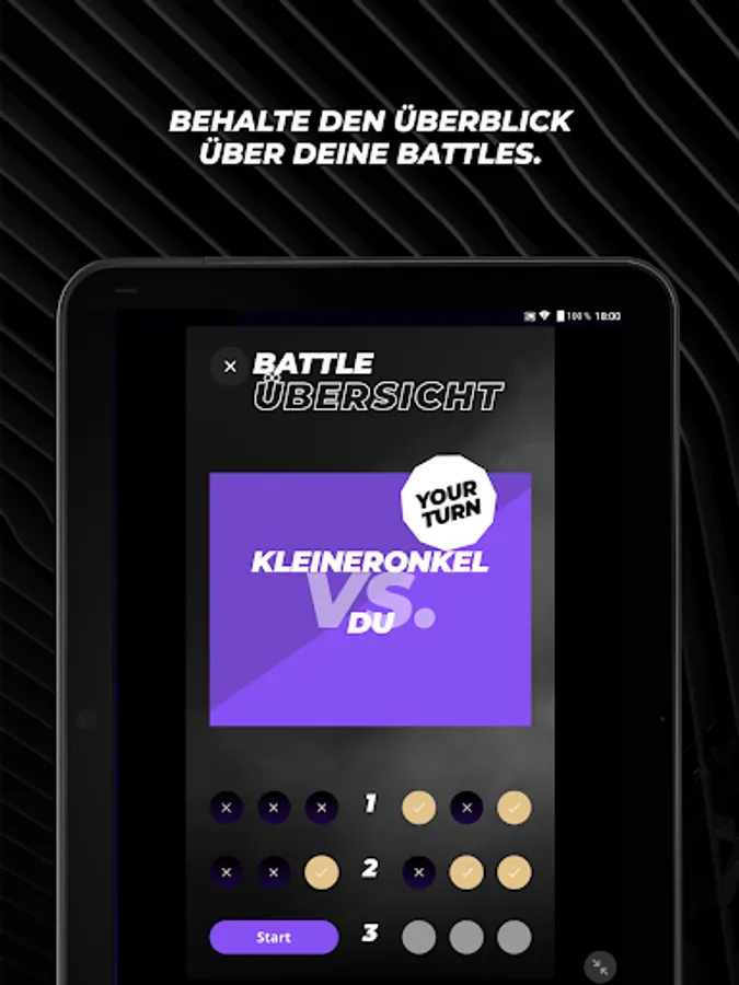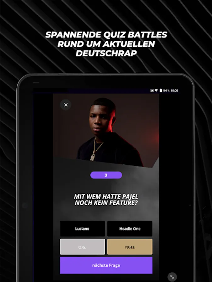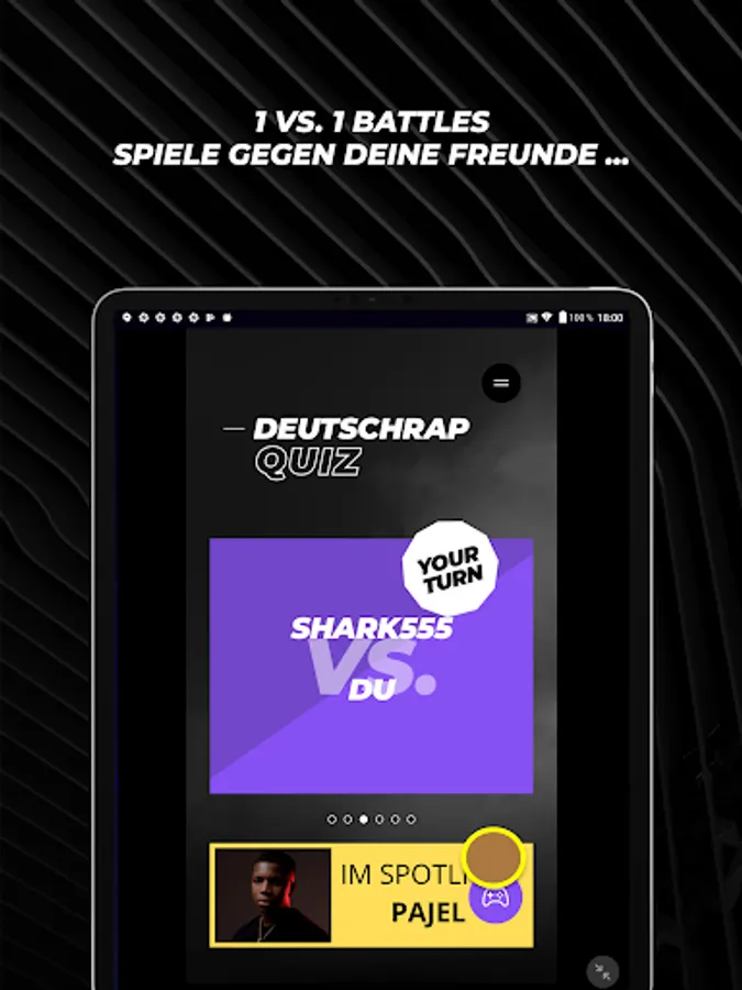 Deutschrap Quiz provides you with exciting 1vs1 battles about current German rap and everything that happens around it. Play against your friends or choose a random opponent! Battle lost? - No problem, because you can always request a rematch! If you create a profile, you can see all your played battles with their statistics.