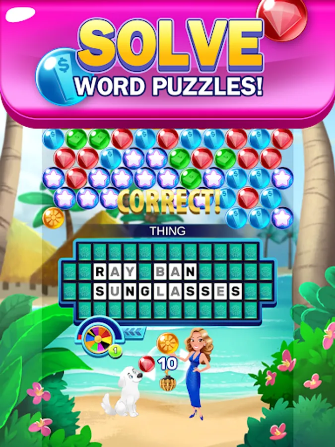 Pop the bubbles and play word games with Vanna White as your host and her favorite furry friends, Stella and Thunder. Tackle word puzzles and escape to exotic getaways as you spin, pop, and solve word puzzles written by the show's very own writers.