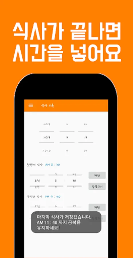 * When the last meal is recorded and saved, the alarm sounds after 16 hours after the end of the fasting time.