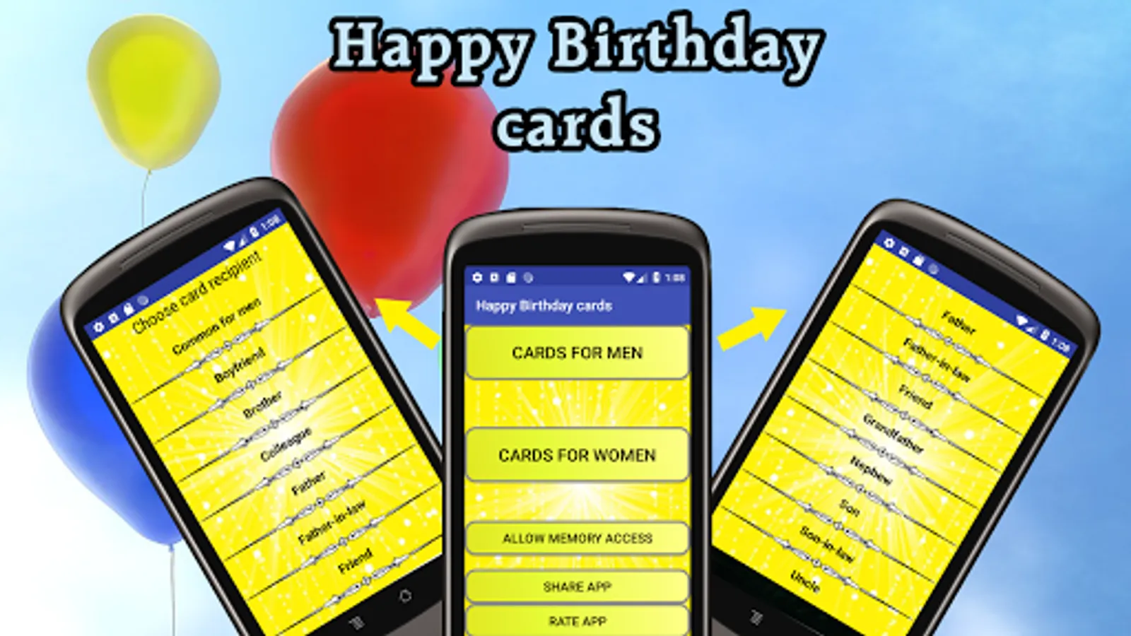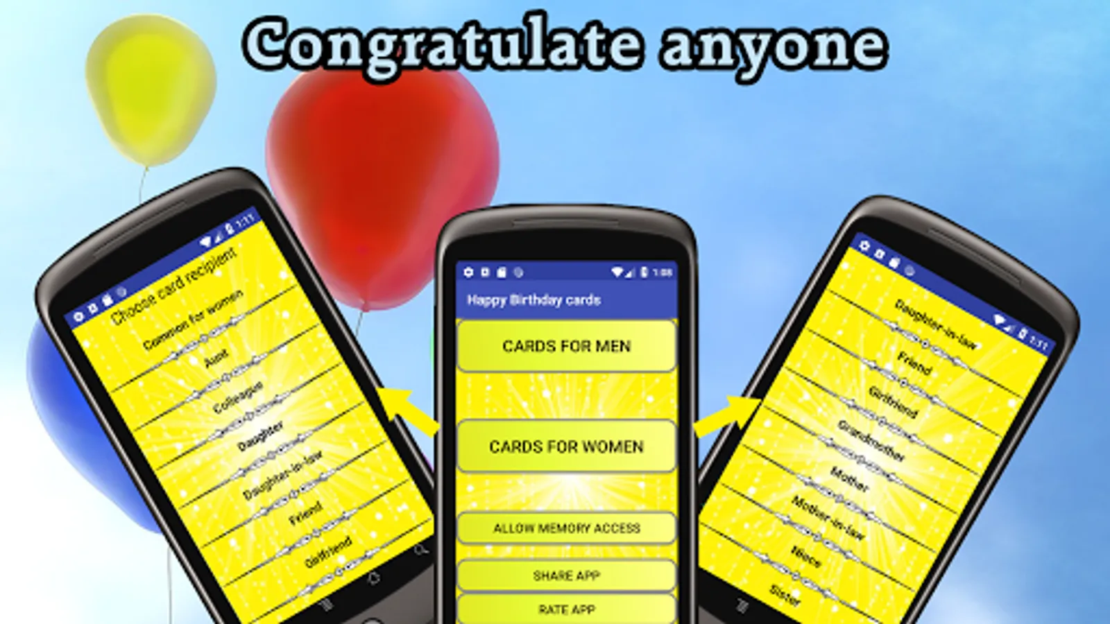 Wish happy birthday to family members, friends, colleagues, just selecting the greeting card from the desired category and sharind it to any social network installed on your smartphone.