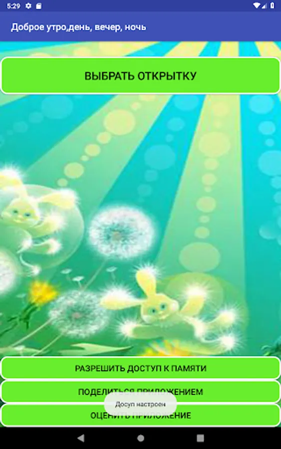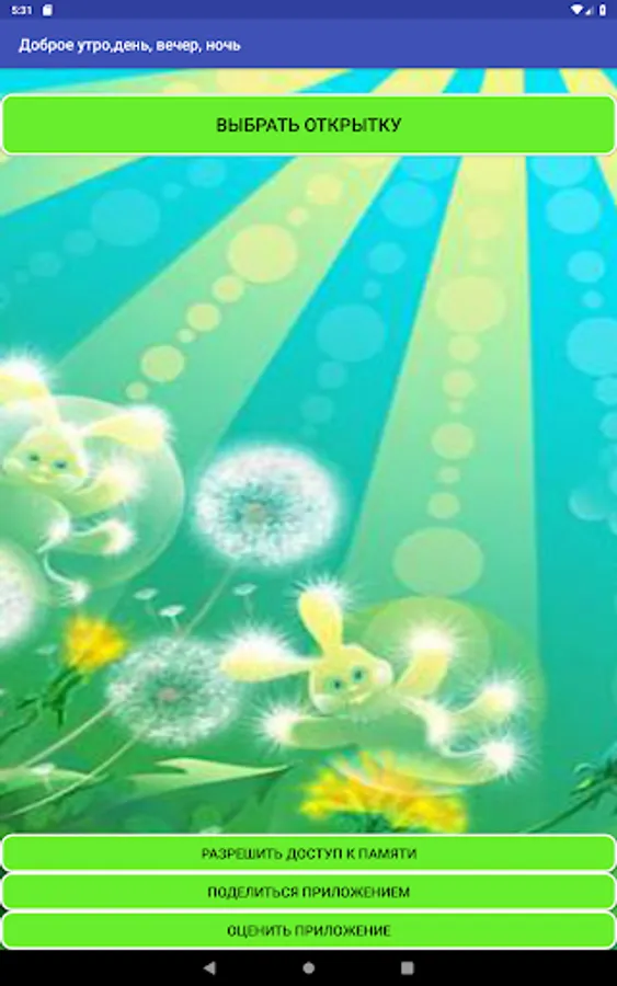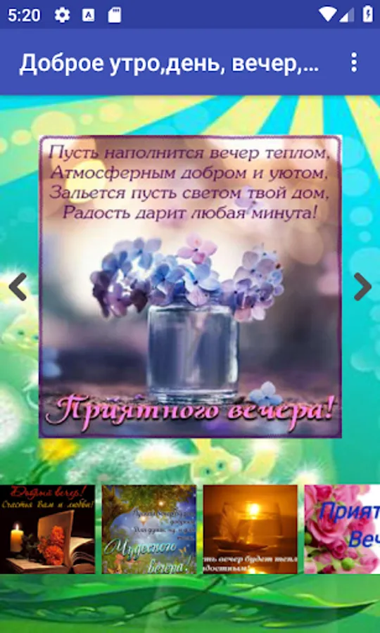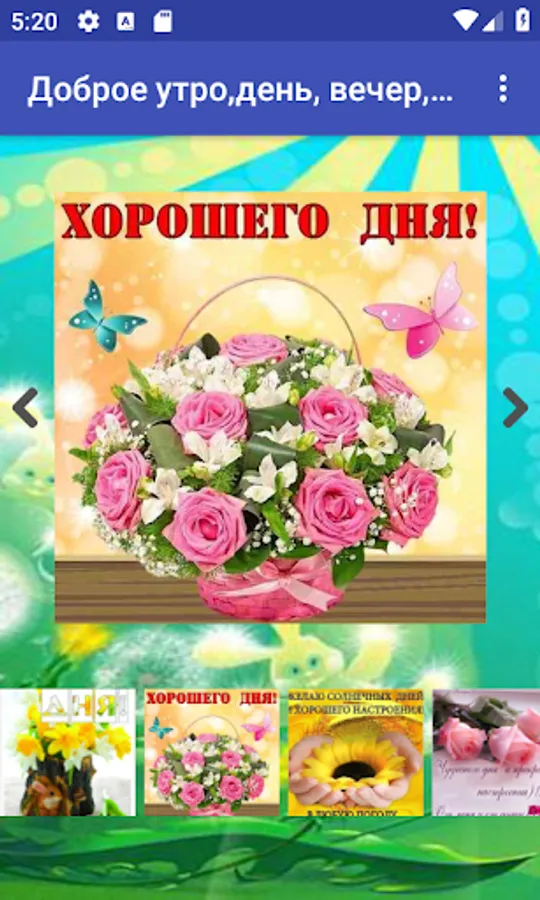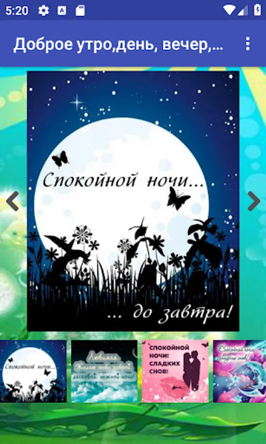 The application provides a large selection of pictures with good morning, good night, good day, pleasant evening, postcards for all occasions.