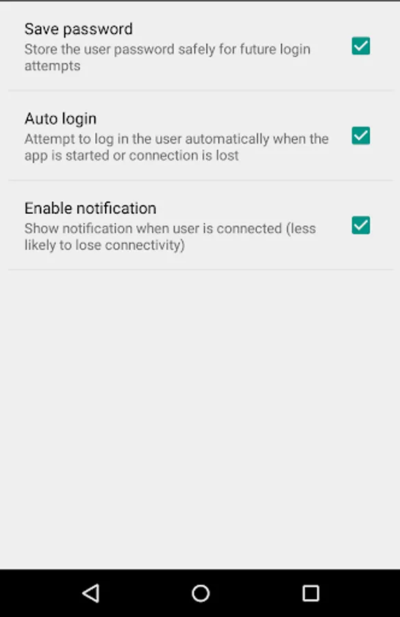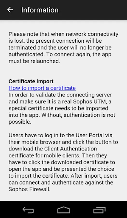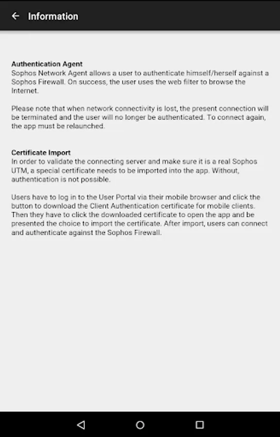 - When launching the app for the first time, the "No certificate found" error might be seen. You need to log into User Portal with your Sophos Firewall username and download the required certificate from there. After importing it into the app, the error will go away and connection will be possible. See help section for more information.