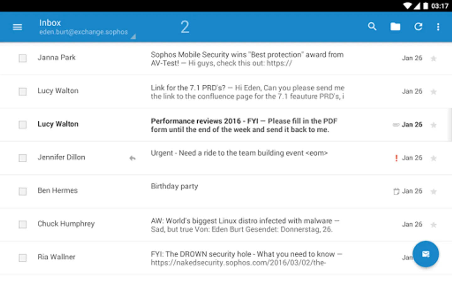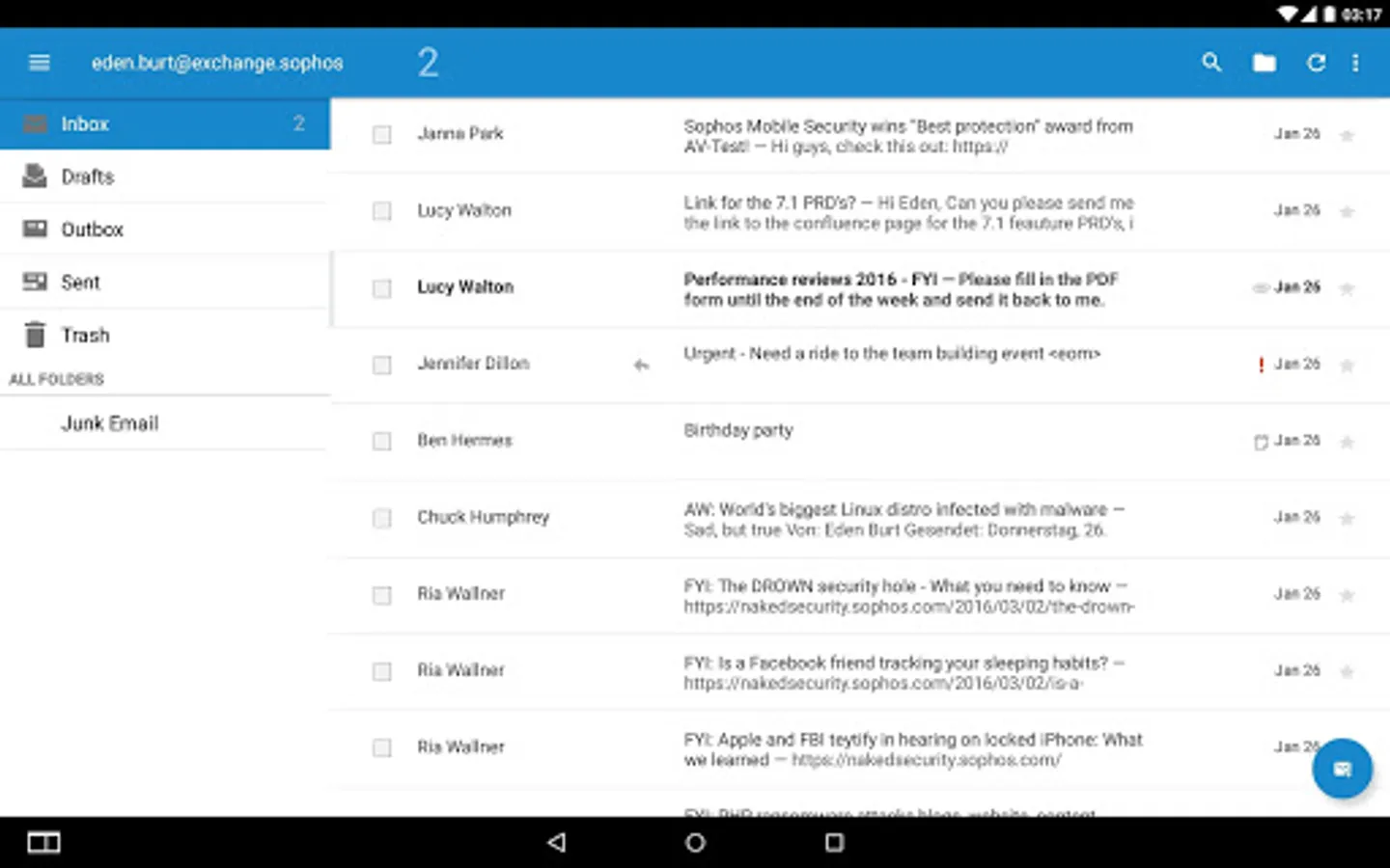 Sophos Secure Email is a containerized and secure email app that lets you fully separate enterprise and private data on your device. It handles the corporate emails, contacts and calendar from the company’s Exchange server. Corporate data is protected with AES-256 encryption and the export of data is controlled by the company’s Data Loss Prevention (DLP) rules. Sophos Secure Email allows the implementation of BYOD programs and fulfills advanced data protection needs in selected industries like finance, government or healthcare.
