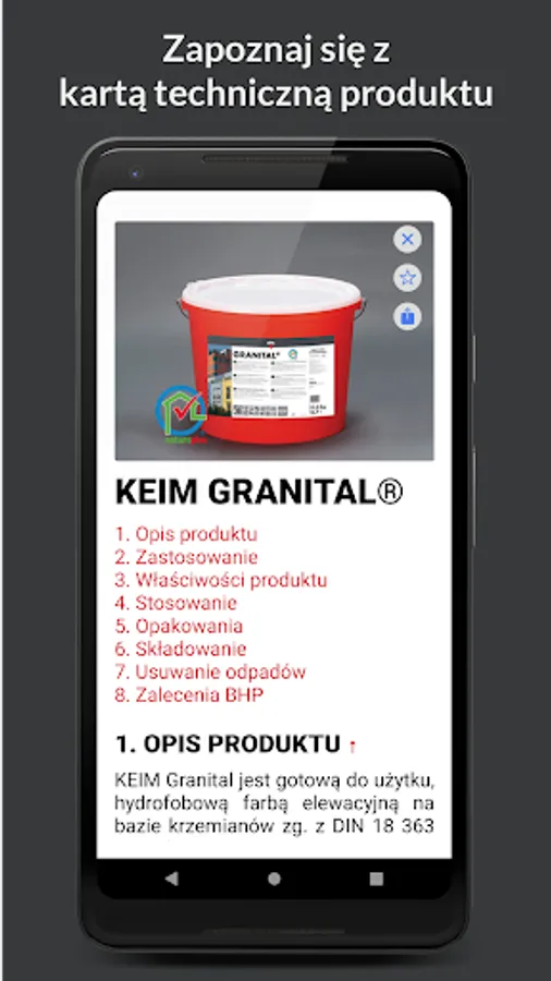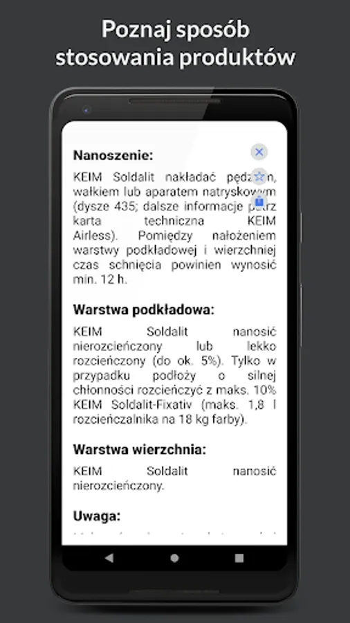The KEIM - Technical Cards application is addressed to designers, investors and contractors of construction works using KEIM products in their projects. Thanks to the application, you can easily and quickly find all necessary information about the use of the product.