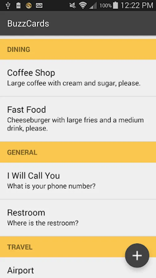 You can write and save cards with the messages you use the most. For example, “Where is the restroom?” or “Where is the nearest bust stop?” You can also make or edit cards on the fly, as needed. The cards are organized by category - for example, “Dining” or “Travel” – to make them easy to find. There is no limit to the number of cards you can create. The BuzzCards app makes face-to-face communication simple; just type it and show it.