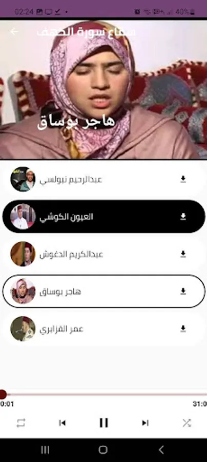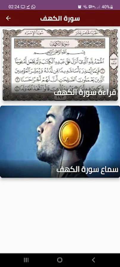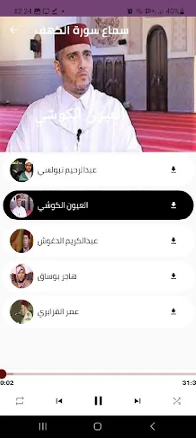 The application of Surat Al-Kahf to read and listen to Surat Al-Kahf in several voices for several great Quran reciters such as Hajar Bousaq, Al-Ayoun Kushi and Abdul Karim Al-Daghush.