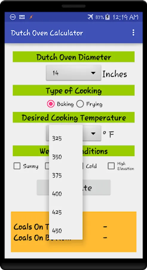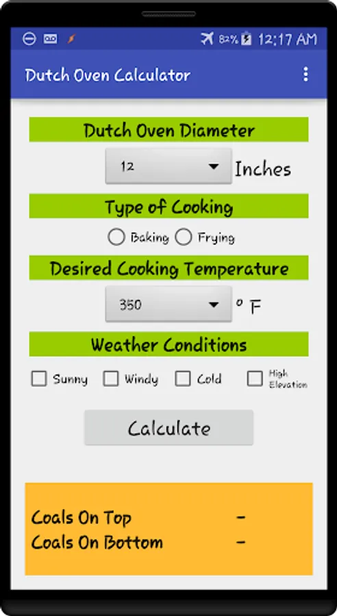 Dutch oven size, desired temperature, and even weather conditions are all configurable.