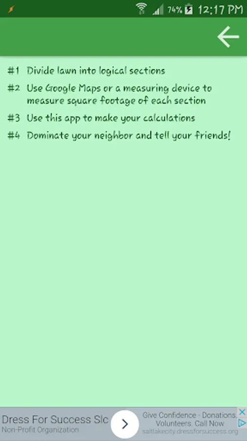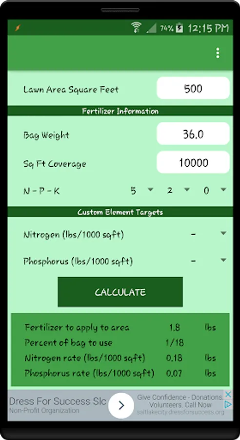 This app will take the guesswork out of how much fertilizer you will need for for a given area of lawn. The idea is to break your lawn up into logical sections so you can fine tune the needs of each area.