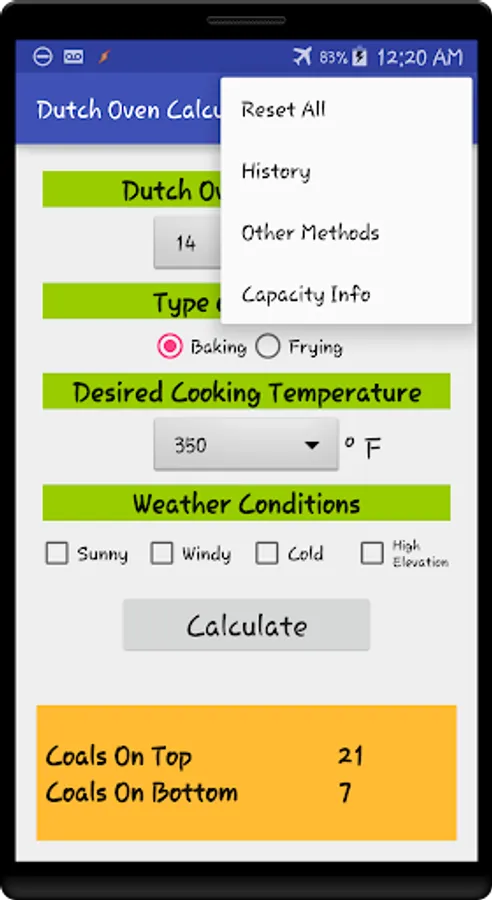 Dutch oven size, desired temperature, and even weather conditions are all configurable.