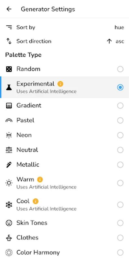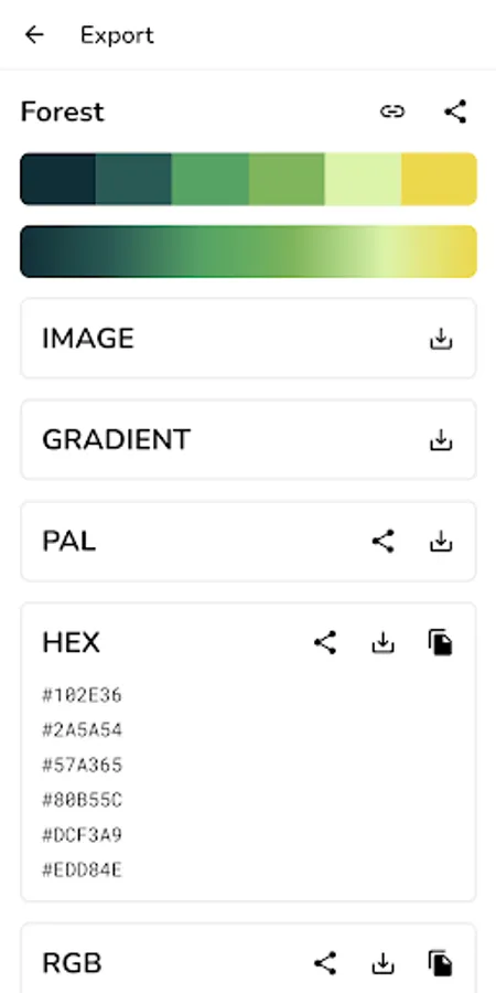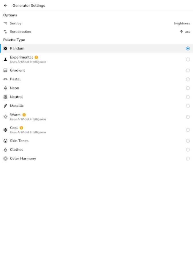 ★ Multiple generator types - Select from a variety of color palette types (random, gradient, pastel, neutral or color wheel harmonies - monochromatic, analogous, complementary, compound, triadic, tetradic and rectangle).
