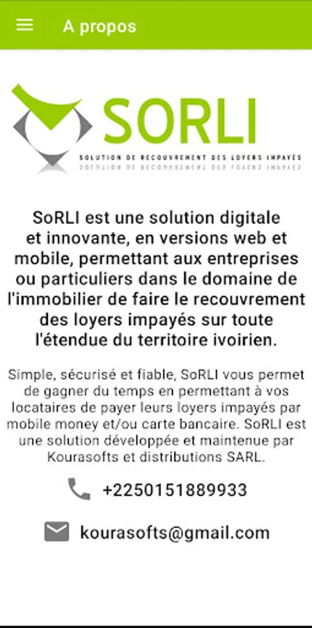 In other words, "SoRLI" is an application in web and mobile version allowing companies or individuals in the real estate field to collect their unpaid rents via existing electronic payment methods (Mobile Money, Visa or Master Card).