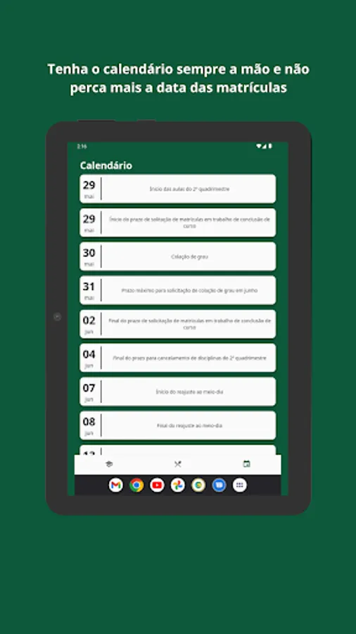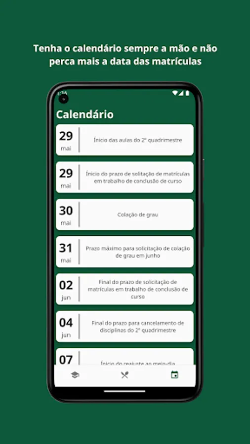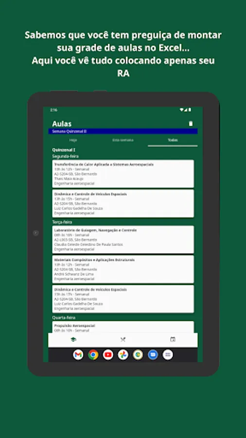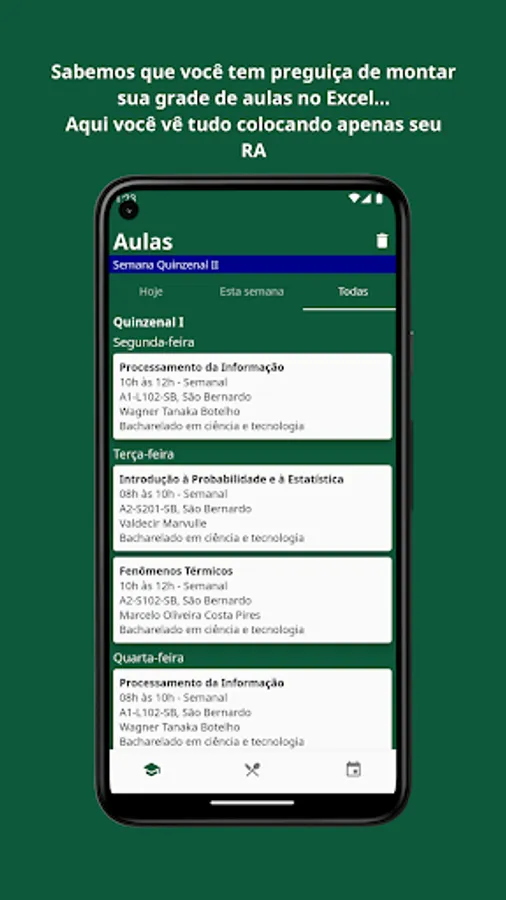 App developed by students for students in order to make the experience at UFABC less maddening, we currently bring information about classes, RU and calendar, but we are working to improve the app and make it more and more complete, feel free to make suggestions for new features.