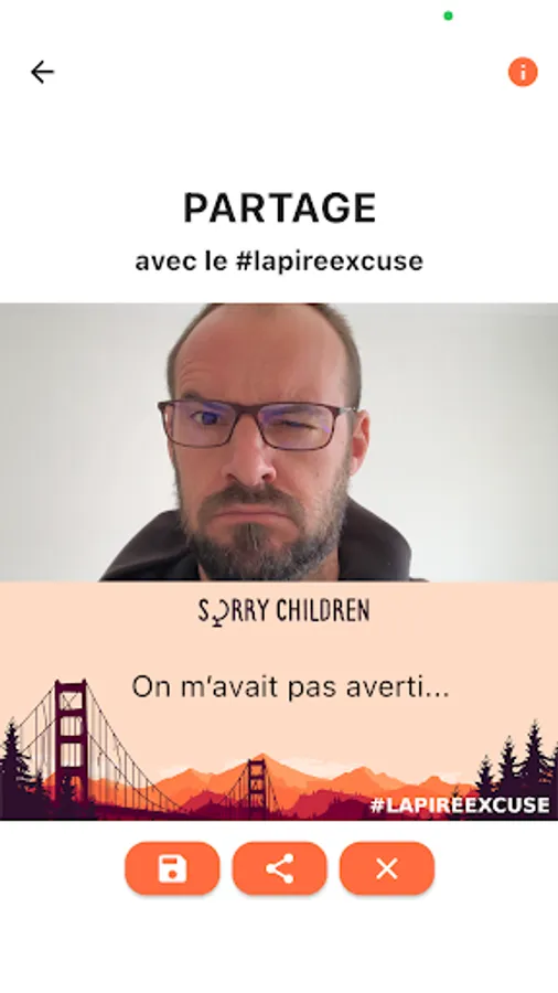- Take a photo of yourself with the Sorry Children sign automatically added to it with your excuse: get creative!