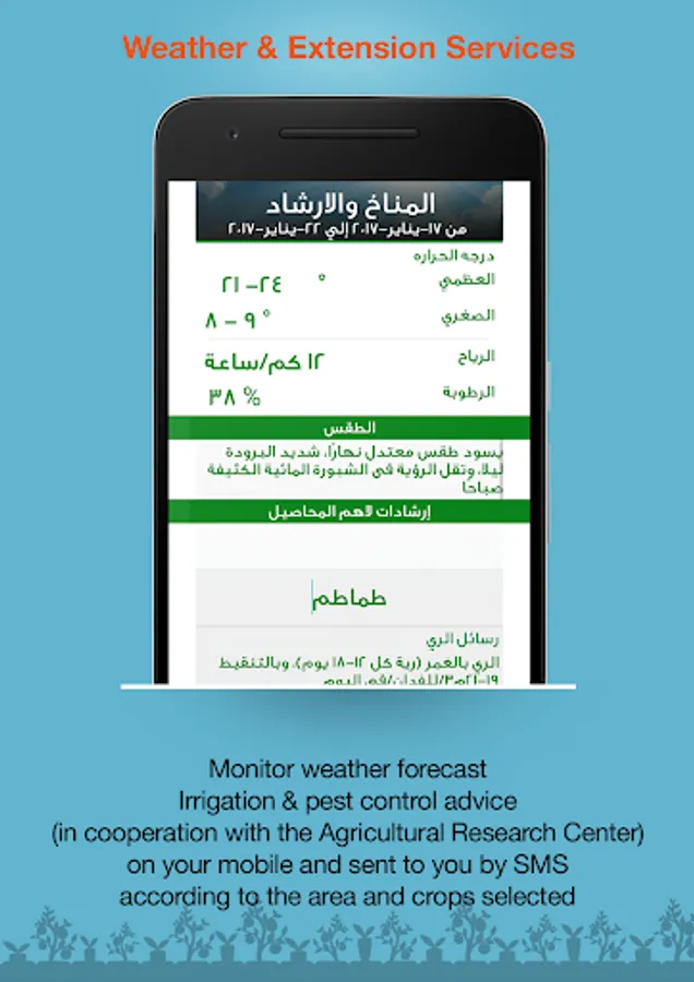 * Daily and weekly SMS with the market prices and weather forecast and technical advice, customized to your registered profile