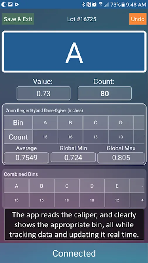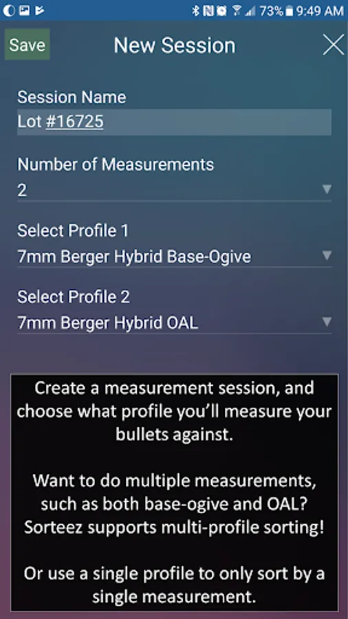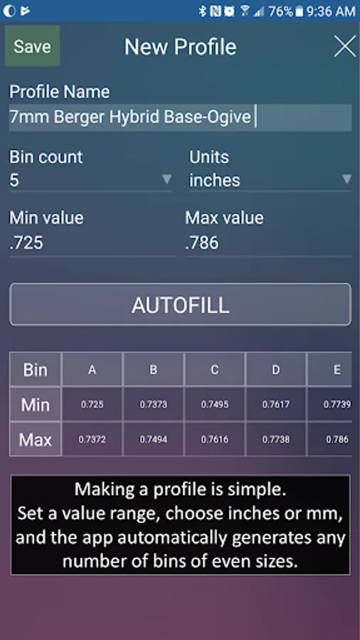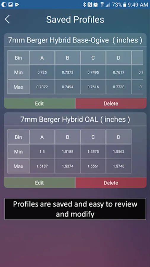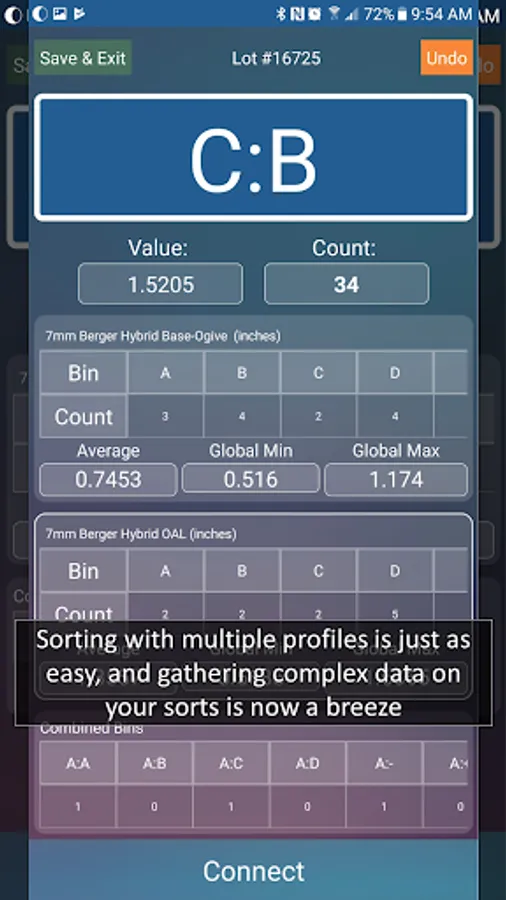 · Create unique profiles by defining the range of values in mm and inches and the number of bins to sort for various measurements. For example, precision marksmen measure bullets by overall length, base-to-ogive, bearing surface, loaded cartridge-base-to-ogive, etc.