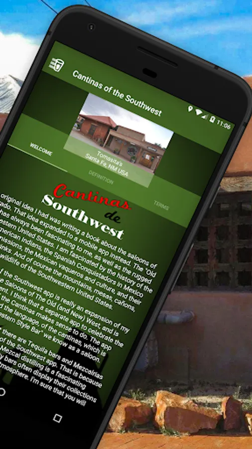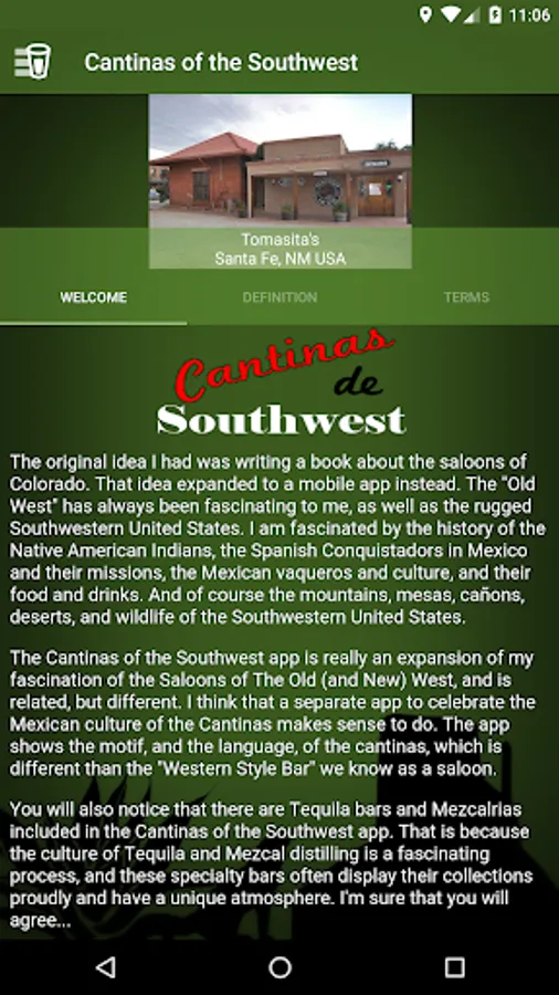 Attention: the Cantinas of the Southwest app is being phased out and being replaced by the Awesome Bars of Planet Earth app. The Awesome Bars app is a combined app of the Cantinas app and others: Saloons of The Old & New West, Pubs of the Australian Outback, Speakeasies of the U.S.A., and Cajun Bars of the Bayou.
