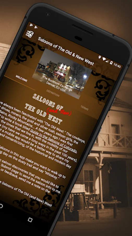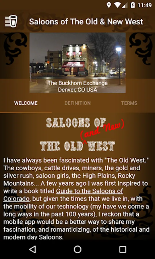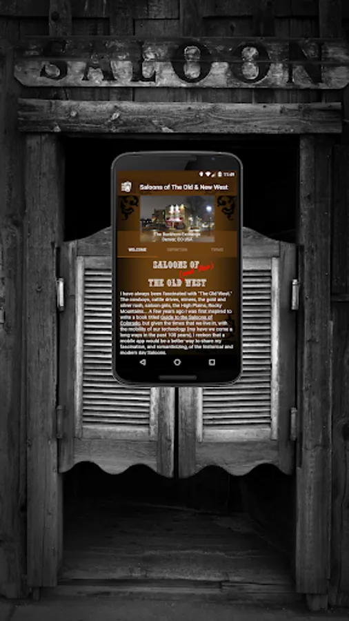 A mobile app that specializes in saloons, bars, and watering holes west of the Mississippi River. The app includes haunted saloons, bars, and the hotels they reside in, as well as the ghost towns of the Old West.