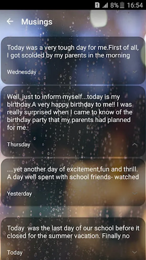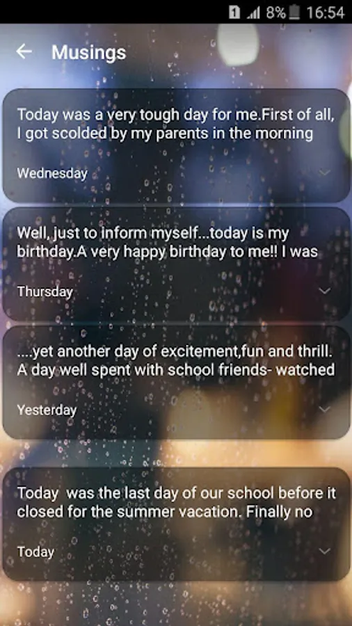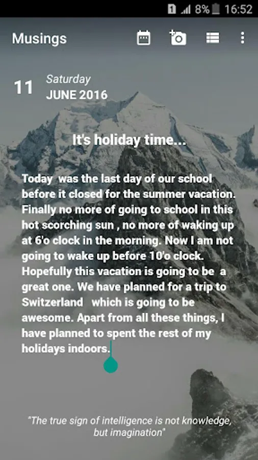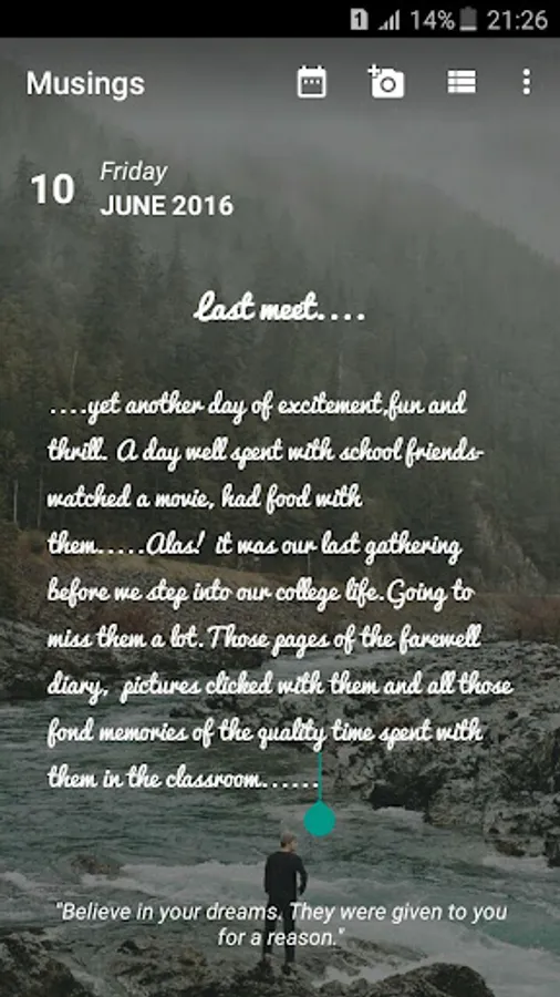 Musings is a simple journal app which allows you to capture your thoughts and ideas, record your activities and experiences throughout a day. With a smooth and user-friendly interface ,this journal app offers you a minimalistic yet efficient way of storing your memories and revisiting them as and when you like. We have tried to preserve the old-school feel of journal writing while at the same time incorporating some of the basic features of a modern day app such as multiple photo entries with background slideshow, changing font style and size etc.