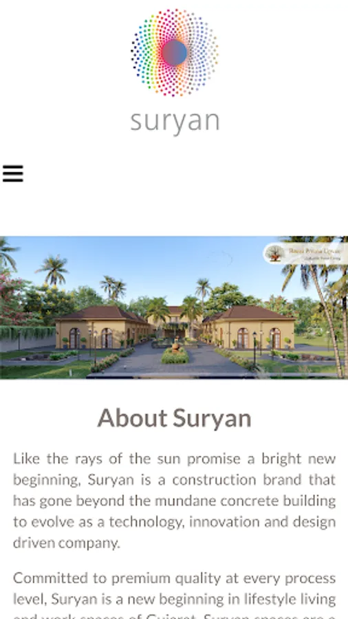 Committed to premium quality at every process level, Suryan is a new beginning in the lifestyle living and workspaces of Gujarat. Suryan spaces are a promise of the best designs, user-friendly, and a deep-rooted environment-friendly policy. Furthermore, taking immense pride in Gujarat’s pivotal role as a growth engine in the development of India, Suryan also pledges its ‘part’ to continue Gujarat’s growth story by enhancing the state's architectural outline as well as changing the face of its infrastructure.