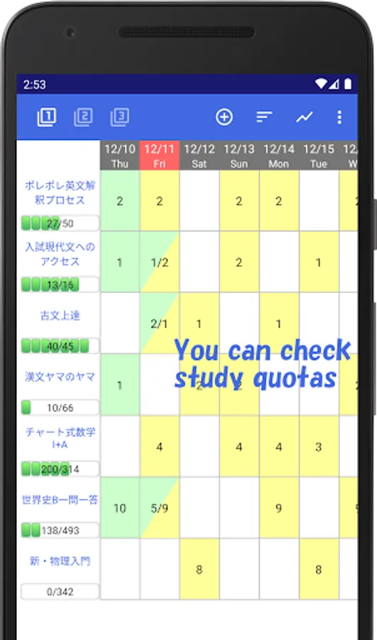 - You can check the quotas of the number of questions to study.