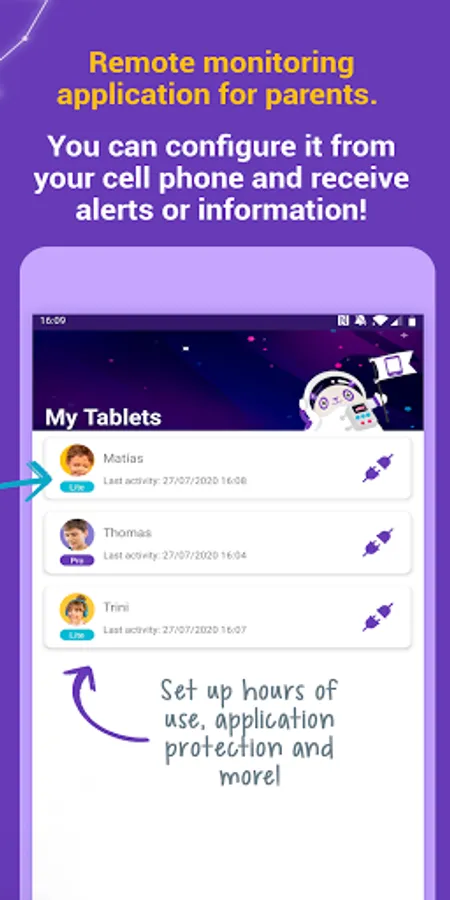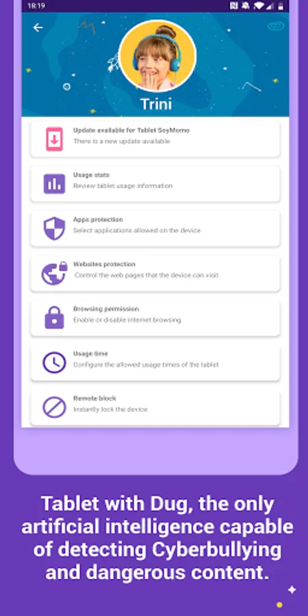 - Control advanced settings of the SoyMomo Tablets, such as: Remote Tablet Blocking, Remote Screen Capture, Alerts for detection of cyberbullying and dangerous content for your children.
