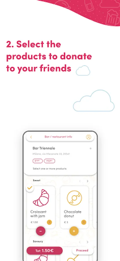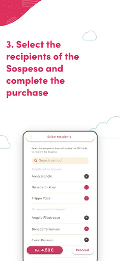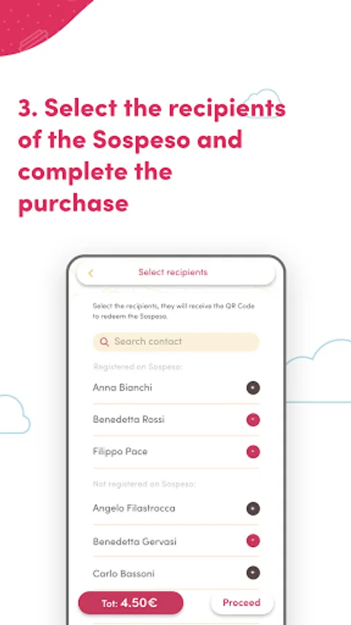 Select an item from the various list proposed by the Sospeso’s Merchants, you can purchase and send your Sospeso to one of your contacts of your phonebook.