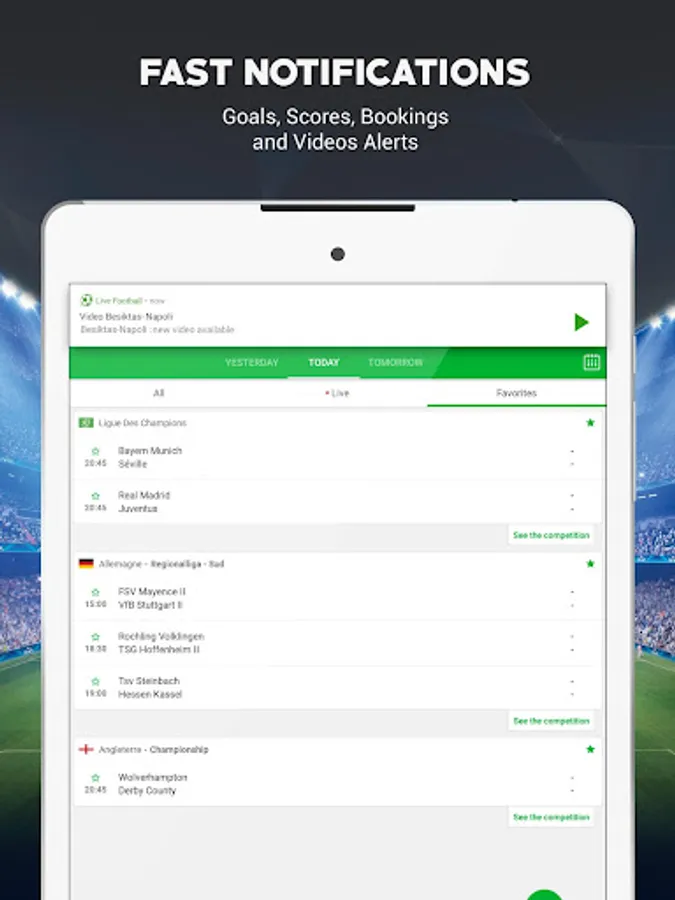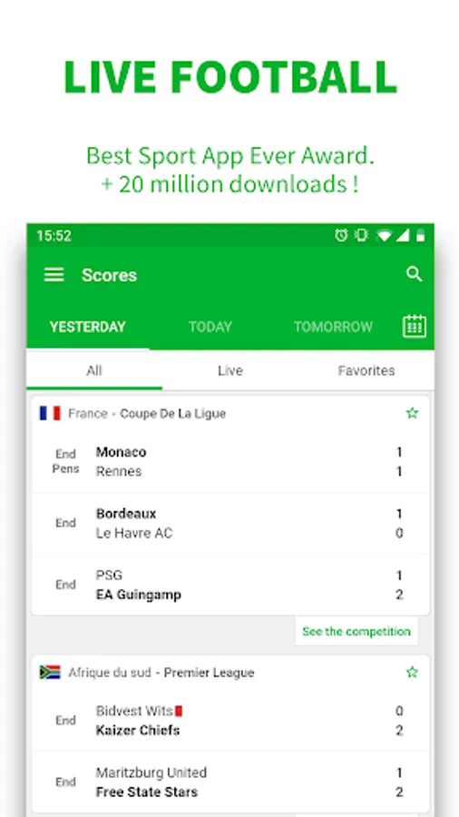- Favourites: Fast access to your favourite teams and competitions. A single click is all it takes to keep up with all the results of your favourite team or competition!