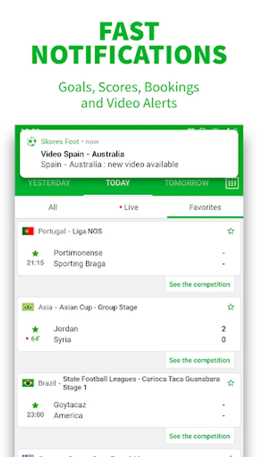 The "Skores - Live Football" application is completely FREE and includes the following features: