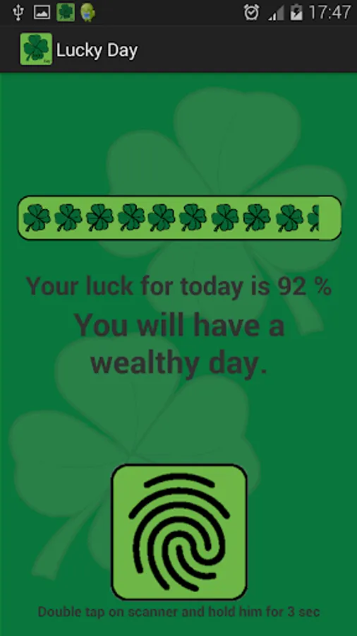 Lucky Day is funny Luck predicting app that provides simple predictions about your daily luck. This app serves as a great day saver by providing simple & entertained luck adviser. If this app helped you, please don't hesitate to share your joy with us! Good luck and have a great day