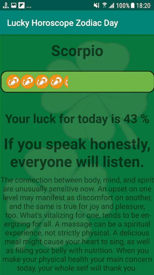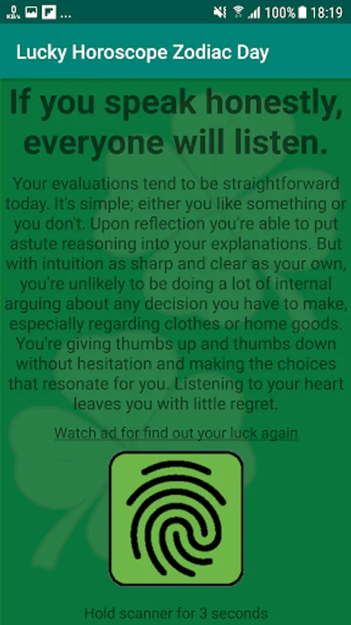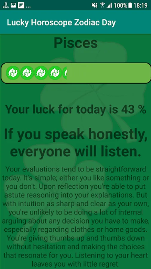 Lucky Horoscope Zodiac Day is funny Luck predicting app that provides simple predictions about your daily luck and your zodiac. This app serves as a great day saver by providing simple & entertained luck and zodiac adviser. If this app helped you, please don't hesitate to share your joy with us! Good luck and have a great day :)