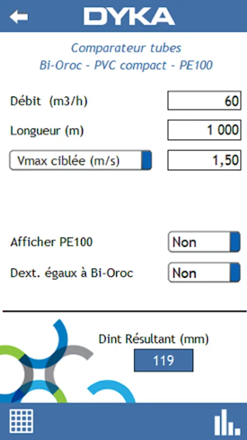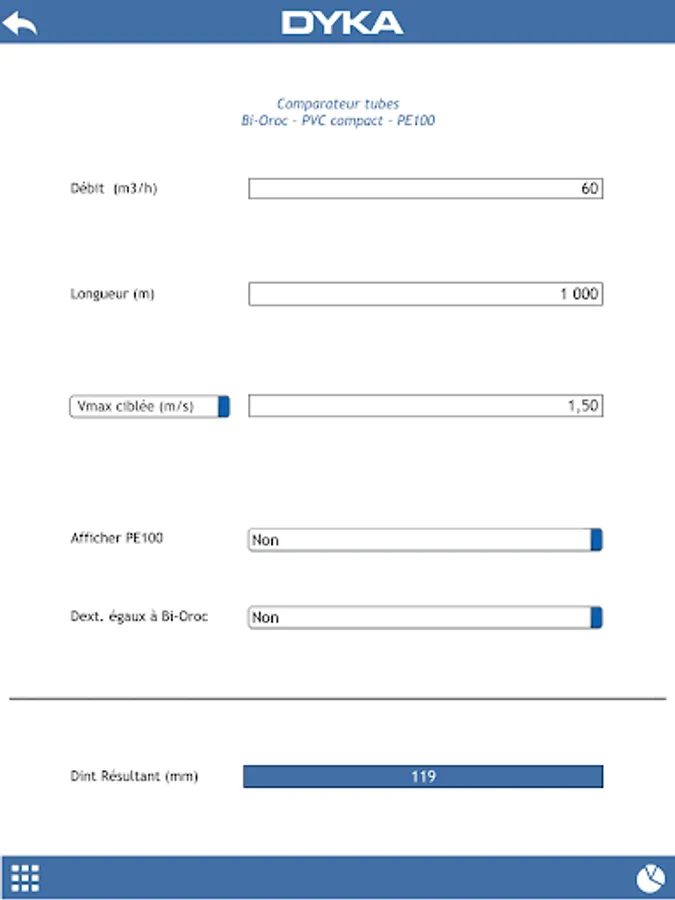The application computes the ideal diameter for the chosen type of pipe (Bi-oroc, PVC-U, PE100) as a function of the flow rate, the length of the network and the maximal speed or head loss tolerated.