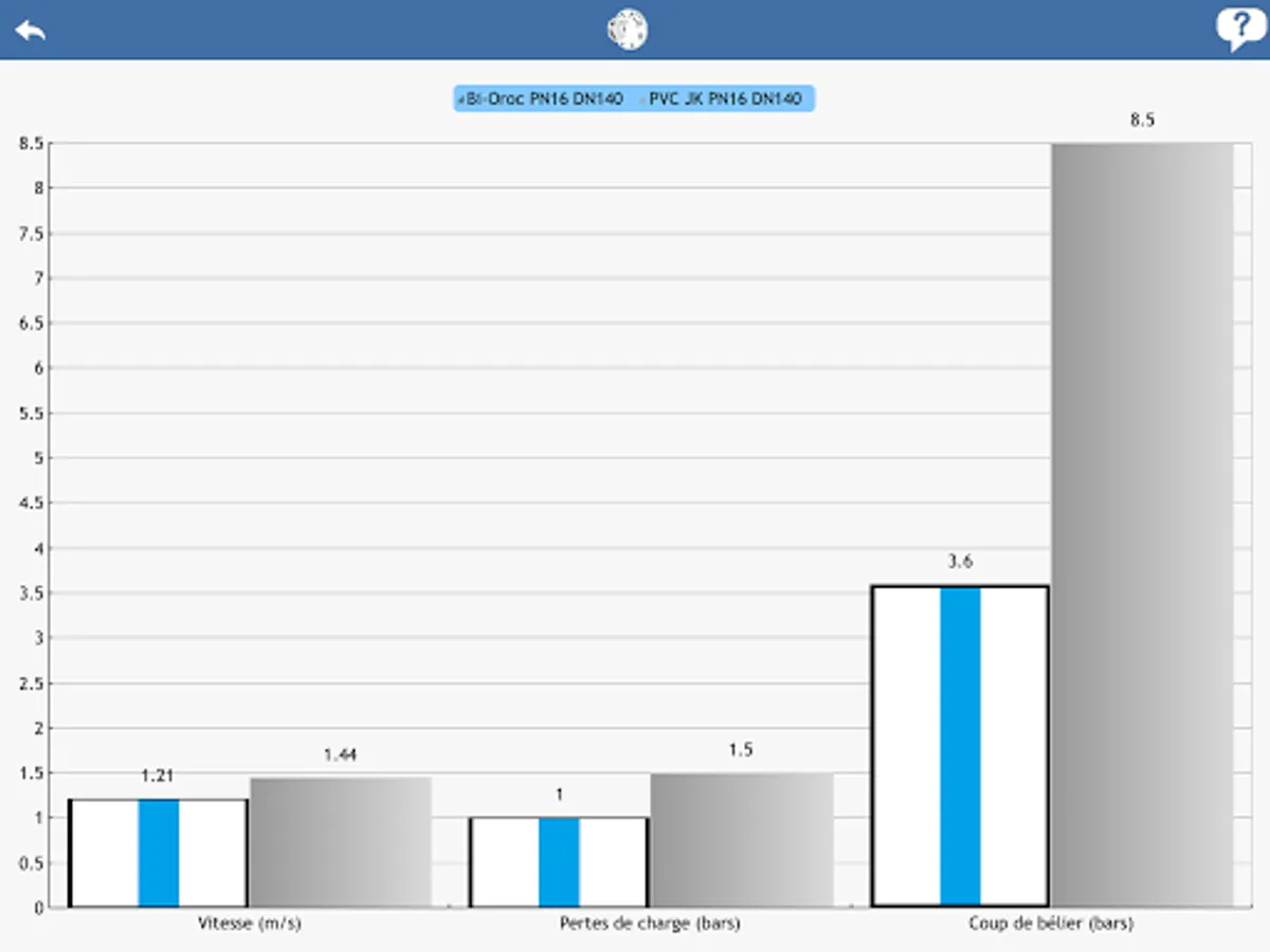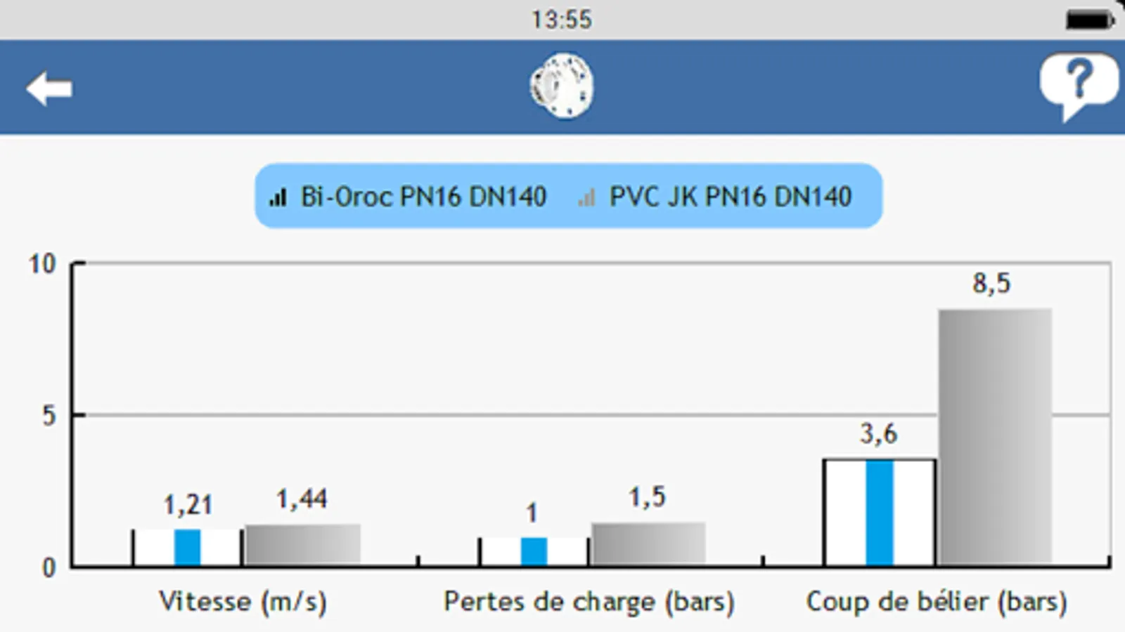 The hydraulic module enables as well the immediate comparison of the performance (speed, head loss, hammering intensity) associated with each material. It shows concretely the exceptional hydraulic performance of Bi-oroc pipes !